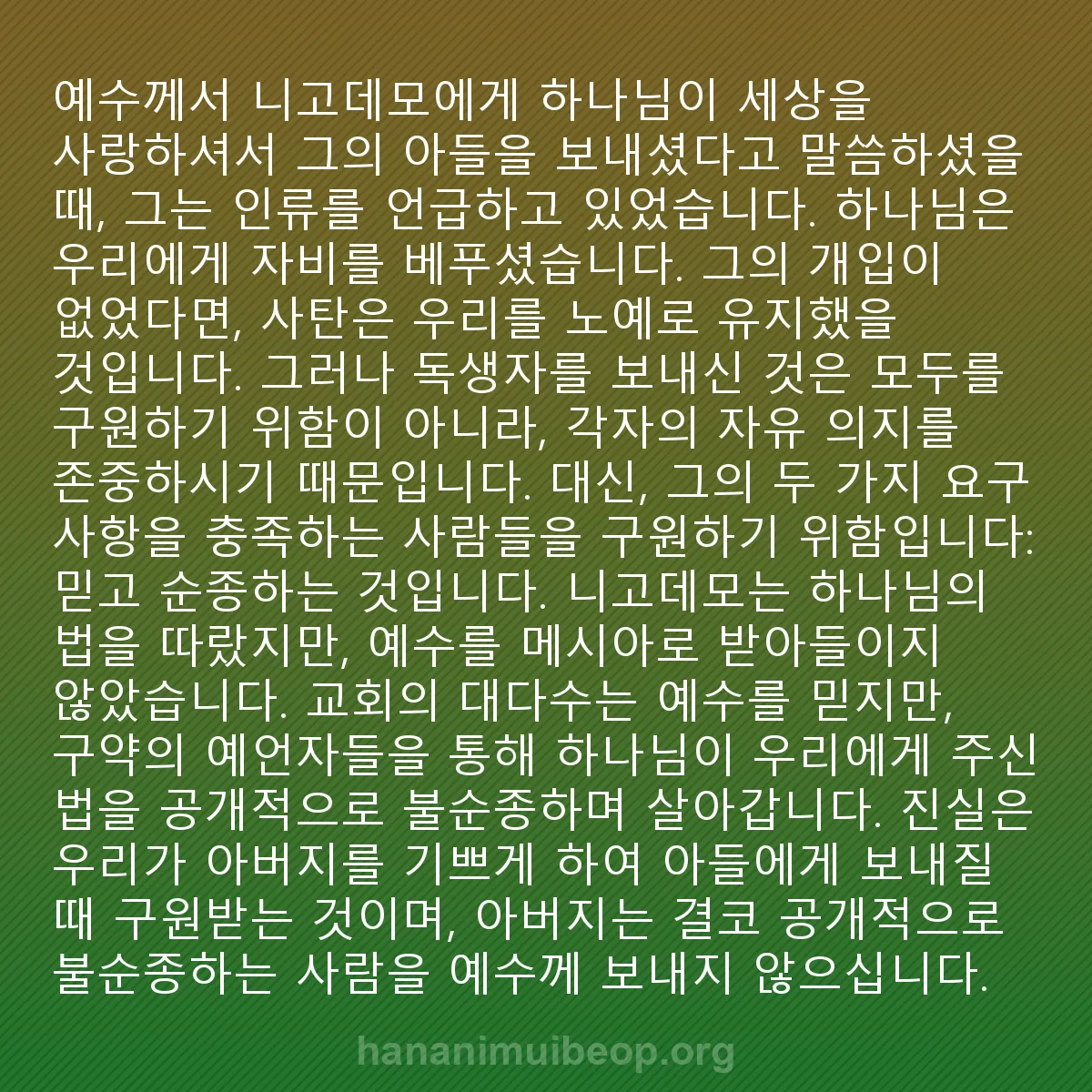 이것이 전환점입니다. 마음이 온전히 순종에 맡겨질 때, 모든 것이 변합니다. 아버지께서 가까이 오시고, 성령께서 우리 안에서 일하시며, 곧 우리는 아들의 용서와 구원으로 인도받게 됩니다. 복잡하지 않습니다. 우리의 무기로 싸우는 것을 멈추고, 하나님의 거룩하고 영원한 계명에 나타난 그분의 뜻에 순복하면 됩니다. 승리는 거기서 시작됩니다. -아서 펜린 스탠리 각색. 내일 다시 뵙겠습니다, 주께서 허락하신다면.