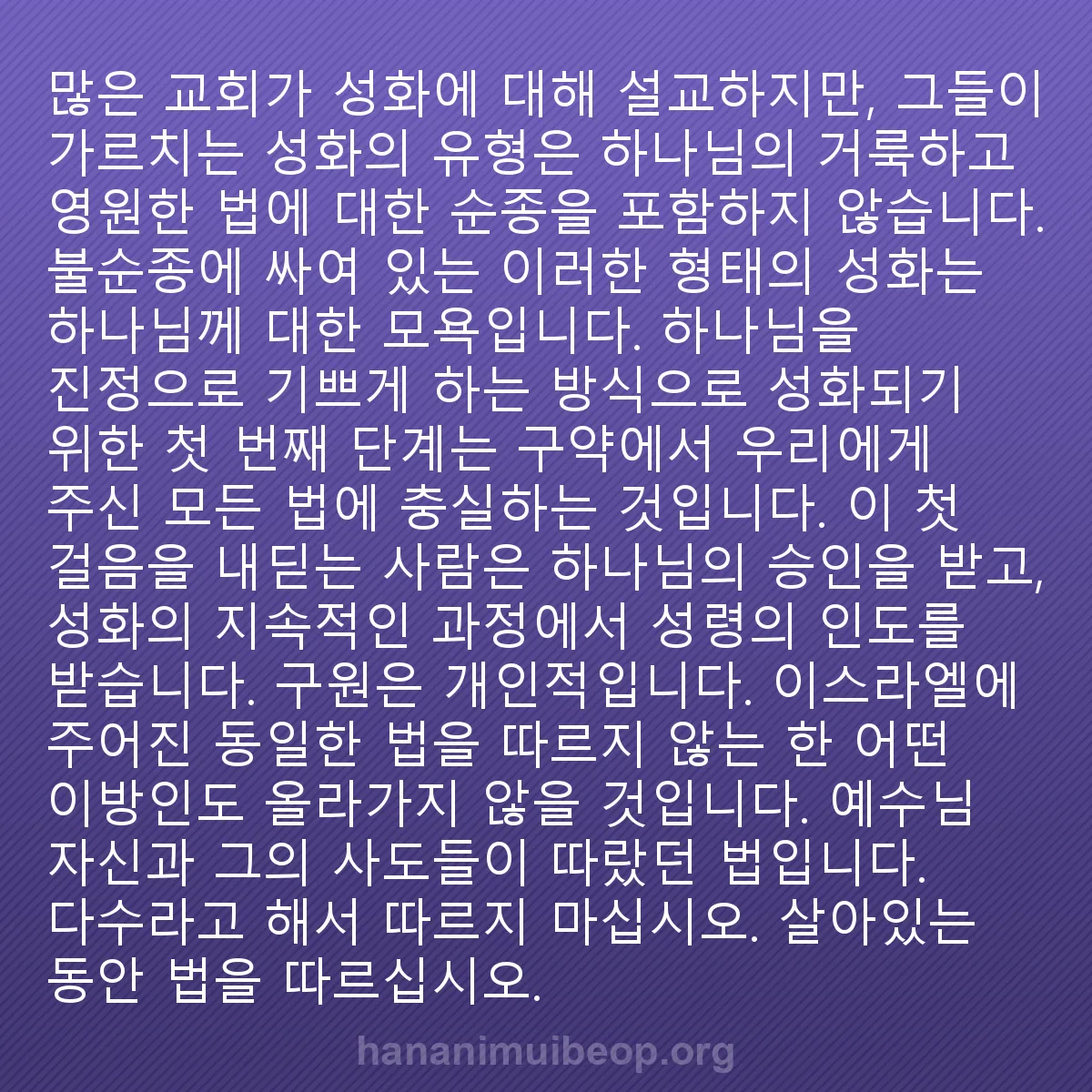 이러한 인식에서 변화의 역사가 시작됩니다. 죄를 드러내는 하나님의 법은 또한 우리가 거룩함의 길을 배우는 학교입니다. 그 법 앞에 자신을 낮추고 성령께서 빚으시도록 허락하는 사람은 생명과 자유를 얻게 됩니다. 이처럼 교만이 거부하는 바로 그 약이 영혼을 치유합니다.